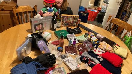 Photo caption: Alison with donated gifts, photo provided and is not set in a care home.