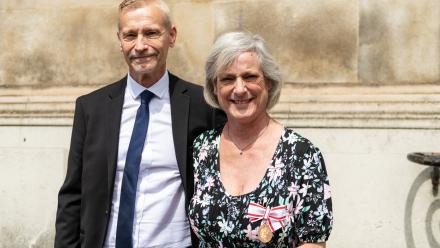 Beverley, with husband Aubrey, with her medal after the ceremony.
