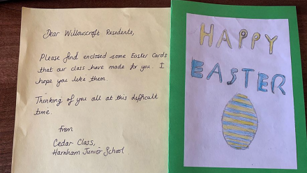 Residents at Willowcroft were overjoyed to receive an email from Duffy the Dog! Duffy lives in South Wales with his human parents who were able to tell them all about him, including his favourite things to do, which includes barking at everything! The home also received 15 Easter cards from Harnham Junior School's Cedar Class.