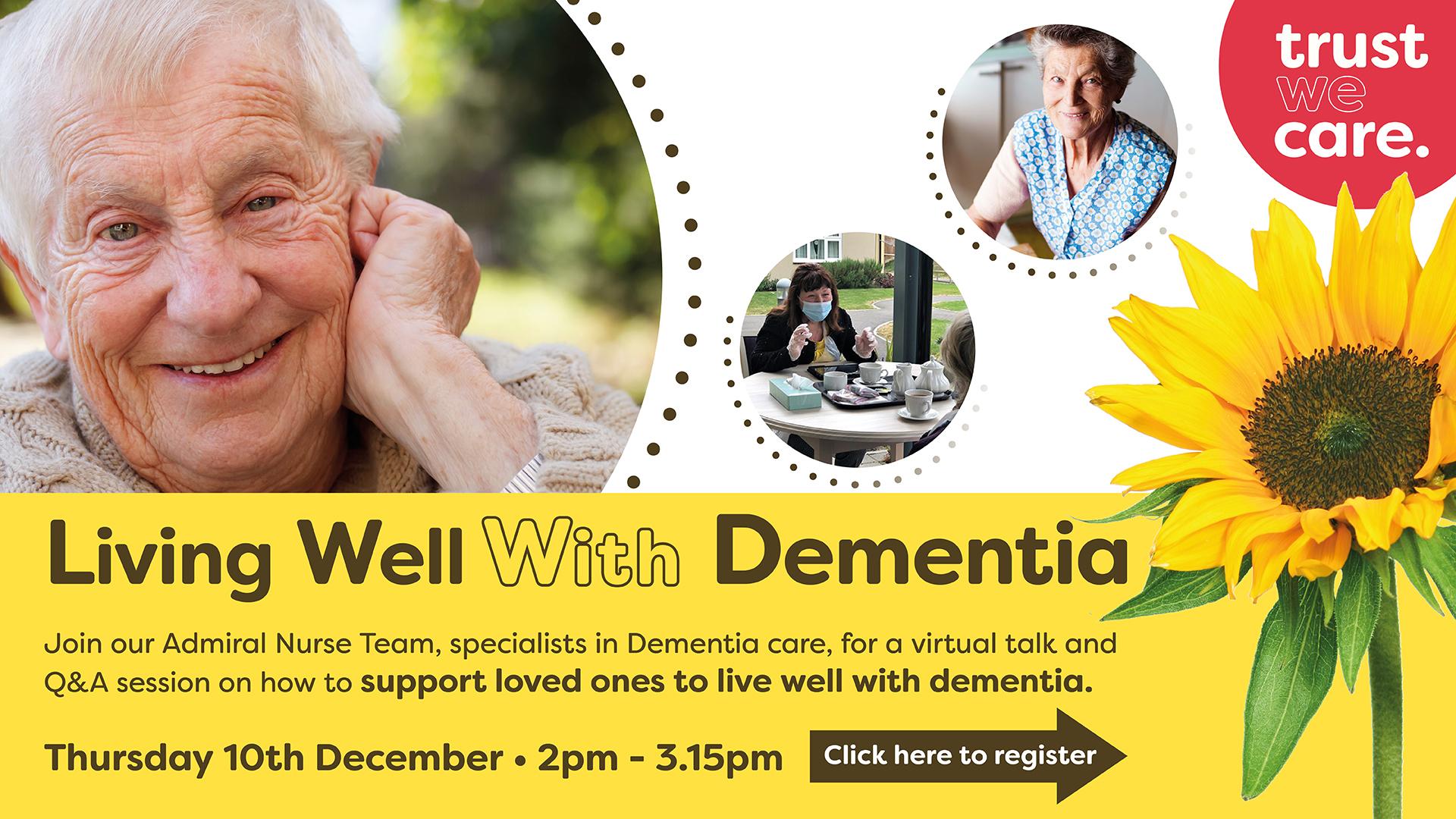 Join us on Thursday the 10th of December, 2pm- 3:15pm, where our Admiral Nurse Team, specialists in Dementia care, will be giving a virtual talk to provide support and advice on how to live well with Dementia and support your loved ones at home.