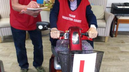 Resident Jean Arnatt has scooter lessons with Activities Coordinator Paul Lucas