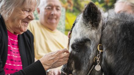 Poppy, part of Dinky Ponies, visited residents at The Cedars in Purton earlier this year. The Miniature Shetland pony’s calm temperament makes her an ideal visitor for older people. She enjoys being petted and resting her head on people’s laps, and residents were delighted to stroke her nose and, with guidance, give Poppy a kiss.