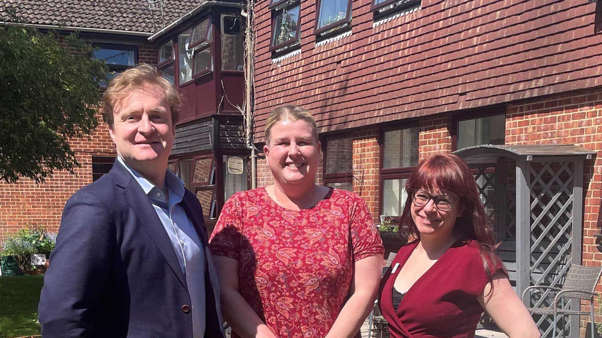Matt Aldridge, Labour Candidate for Salisbury, discusses dementia services with Rebecca Flood, Bemerton Lodge Home Manager and Stephanie Smart, Admiral Nurse.