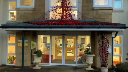 Volunteer Lynn Edwards has organised a cascade of hand knitted poppies, now on view at the Malmesbury Care Home, run by OSJCT. The poppies are displayed across the front of the building on Priory Way.