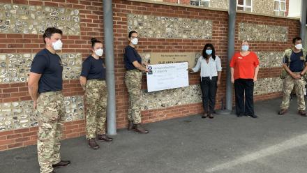 Photo: Soldiers of 127 (Dragon) Battery, 19 Regiment Royal Artillery present a cheque to Mercy Mautsi, Home Manager of Avon Court and Sharon Payne, Home Manager of Bourne House.
